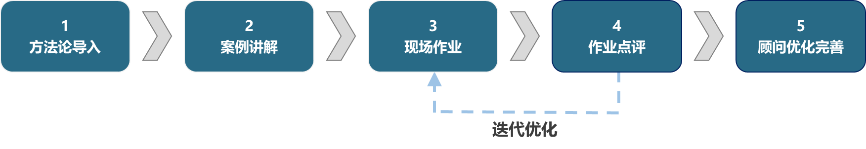 任职资格设计工作坊,采取“方法培训+案例讲解+现场作业+作业点评+顾问优化”五步循环迭代的方式进行: